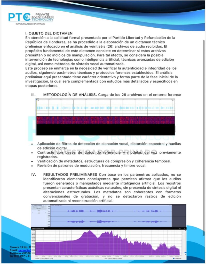 La agencia PTC Private Investigation Technology, con sede en Bogotá, Colombia, presentó un dictamen pericial preliminar que certifica la autenticidad de los audios atribuidos a la consejera hondureña Cossette López, tras una solicitud formal presentada por el Partido Libertad y Refundación (Libre).