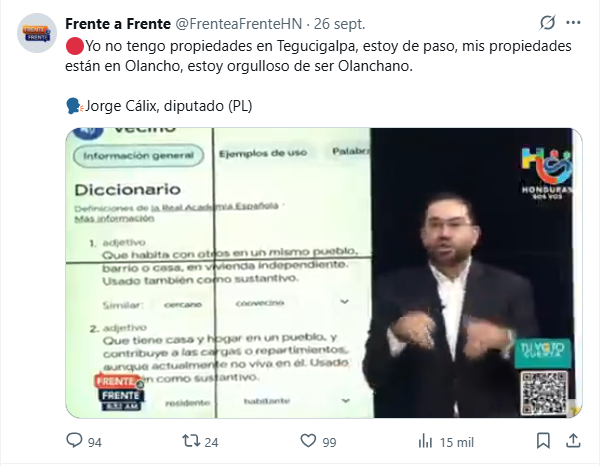 El 26 de septiembre, Jorge Cálix apareció en exclusiva en el programa Frente a Frente, donde defendió su supuesta vecindad y dijo sentirse “tan olanchano como el tapado”, pese a que los documentos oficiales lo desmentían.