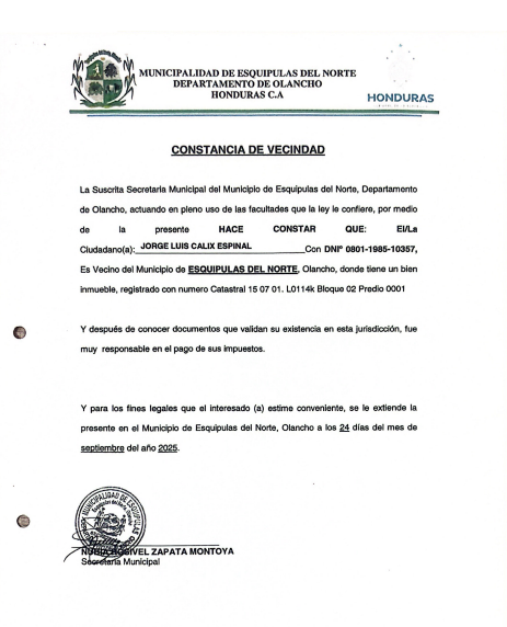 El 24 de septiembre, la alcaldía de Esquipulas del Norte, otro municipio de Olancho, emitió una constancia de vecindad que acreditaba falsamente a Cálix como vecino y propietario de un terreno en esa jurisdicción.