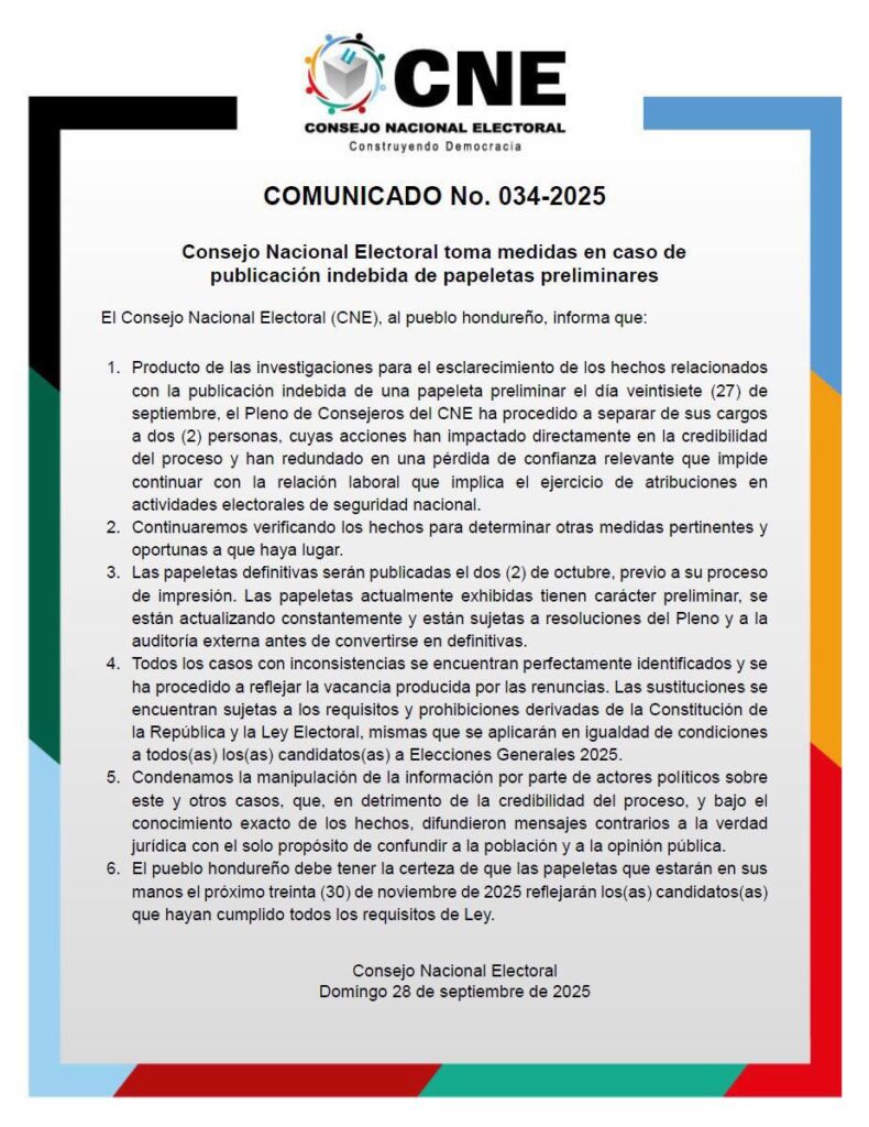 El 28 de septiembre, el CNE despidió a dos de sus empleados por haber facilitado la divulgación irregular de la papeleta con la foto de Cálix, al considerar dañada la credibilidad institucional.