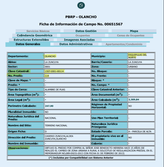 Al verificarse en el catastro, el inmueble citado en la constancia, con clave catastral 1507-01 Lote 114, Bloque 02, Predio 0001 (1507-0001-00114) aparece realmente a nombre de Luis Alonso Ramírez Núñez, y no de Cálix, confirmando el indicio de falsificación de documento público.