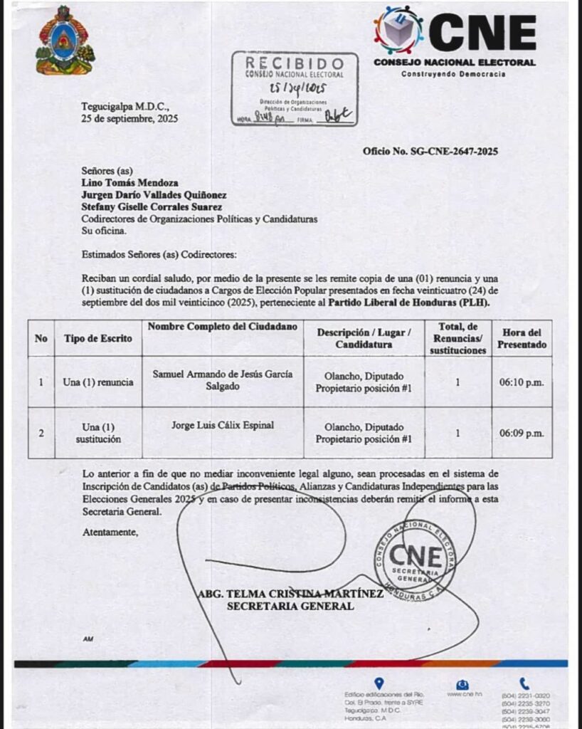 Ese mismo 24 de septiembre, el Consejo Central Ejecutivo del Partido Liberal (CCEPL) —presidido por Roberto Contreras Mendoza— comunicó la renuncia del candidato electo Samuel Armando de Jesús García Salgado y solicitó al CNE inscribir en su lugar a Jorge Cálix, pese a que este era diputado por Francisco Morazán y había sido precandidato presidencial liberal en marzo de 2025.