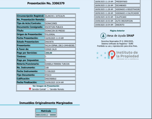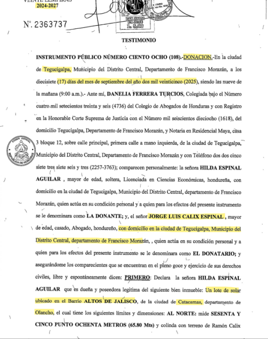 Siete días antes de tramitar su inscripción ante el CNE, Jorge Cálix recibió en donación de su madre, Hilda Espinal Aguilar, un terreno en Catacamas, Olancho (matrícula 1534512), según la escritura pública No. 108 del 17 de septiembre de 2025.