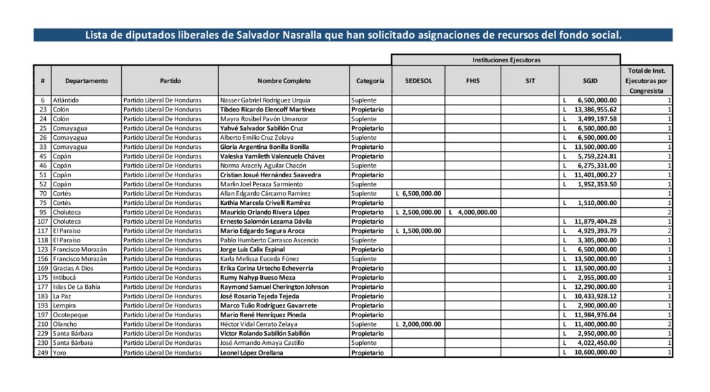 Cabe señalar que entre los montos gestionados por los diputados liberales figuran cifras millonarias: Yahvé Sabillón aparece con 6,500.000.00, Gloria Argentina Bonilla, con 13,000,000.00, Kathia Crivelli, 1,510.000.00, Mario Segura, 4,929.393.79, Jorge Cálix, 6,500.000.00.