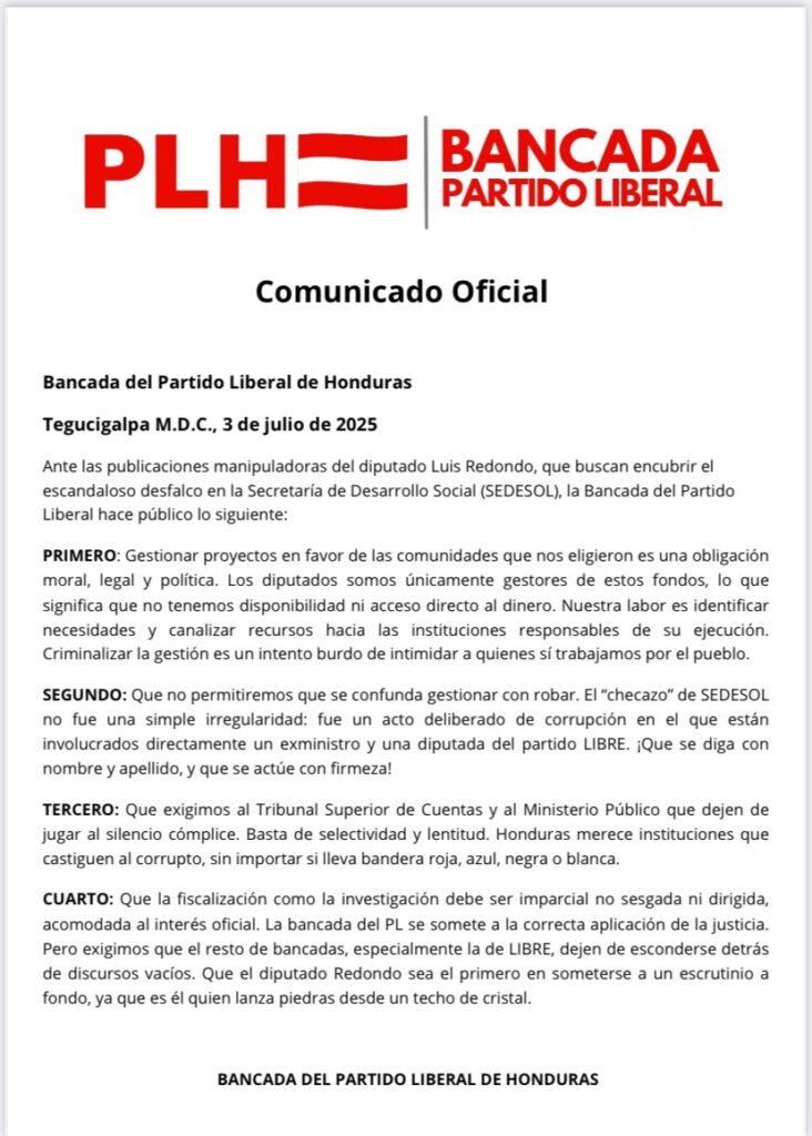 Luego que el presidente del Congreso Nacional, Luis Redondo, revelara un listado de diputados liberales que solicitaron asignaciones del fondo social —incluyendo a legisladores cercanos a Salvador Nasralla como Jorge Cálix, Mario Segura, Gloria Bonilla, Kathia Crivelli y Yahvé Sabillón—, la bancada del Partido Liberal respondió públicamente defendiendo su actuar.
