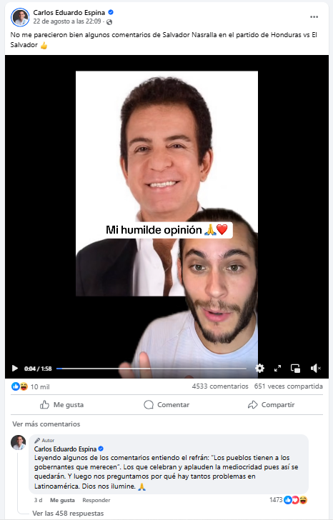 Aunque no es salvadoreño, Carlos Eduardo Espina condenó la actitud de Nasralla, calificándola como un discurso violento, inaceptable y carente de ética, sobre todo viniendo de alguien que aspira a la presidencia de Honduras.