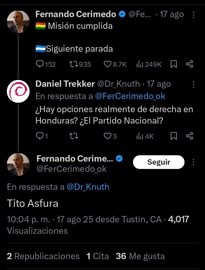 Recientemente, Cerimedo anunció su labor como estratega de campaña para Asfura, mientras este último también enfrenta críticas en Honduras relacionadas con el presunto desvío de más de 28 millones de lempiras durante su gestión como alcalde de Tegucigalpa.