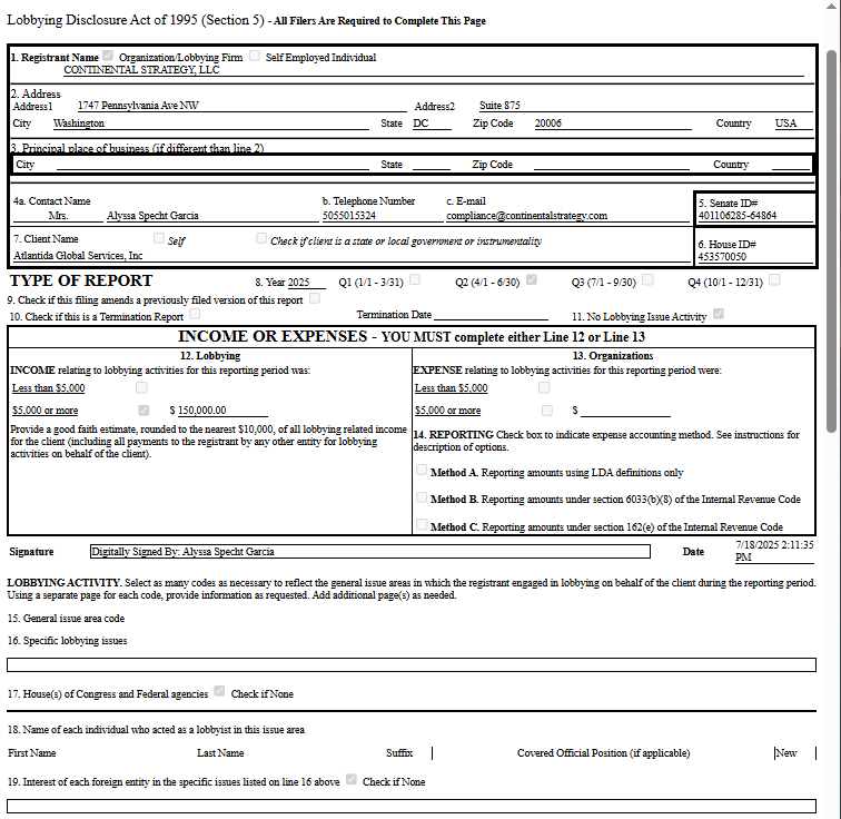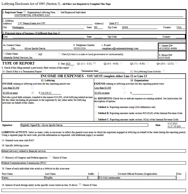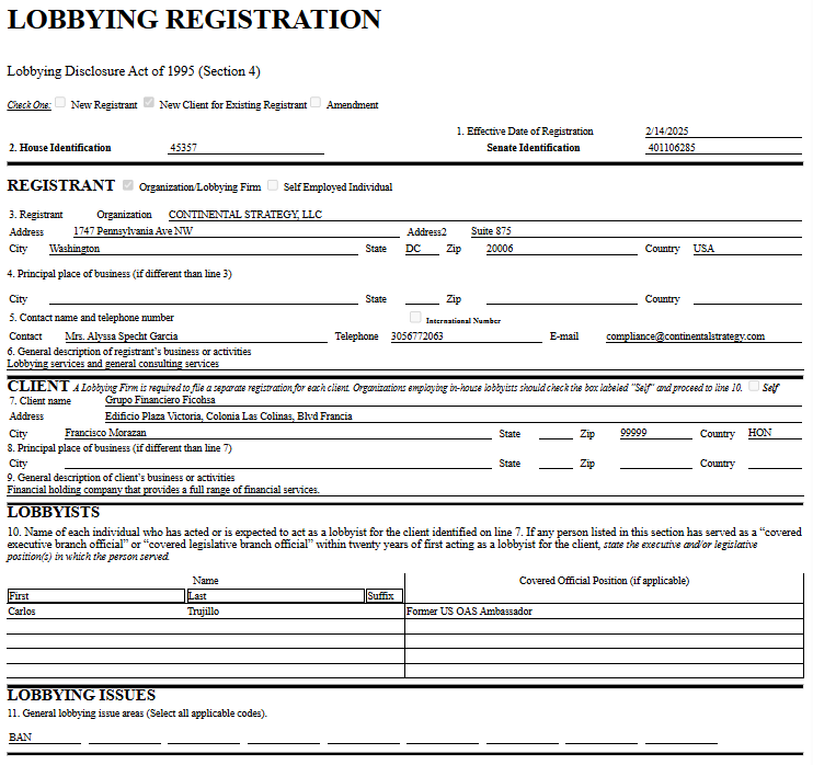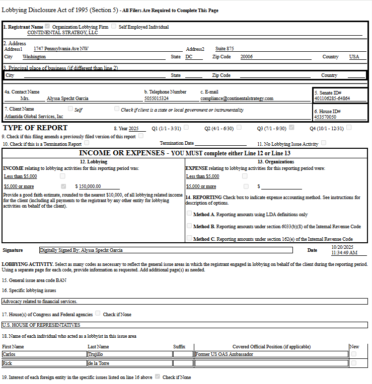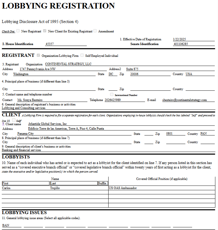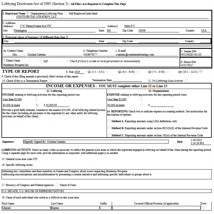 Según los registros públicos del Congreso estadounidense bajo la Ley de Divulgación de Cabildeo (LDA), Continental Strategy recibió al menos: