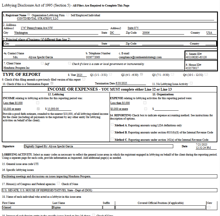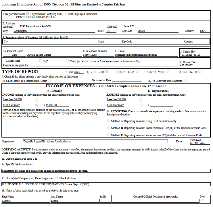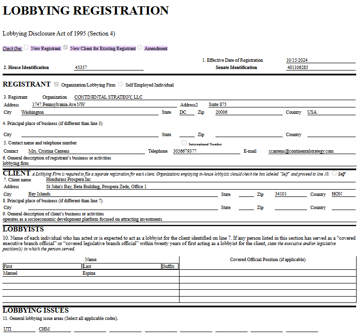 Los formularios de cabildeo muestran actividades de índole político-económica general, como “proteger inversiones estadounidenses en Honduras”, “promover la imagen de Próspera”, contrarrestar desinformación e informar a comités del Congreso sobre el proyecto.
