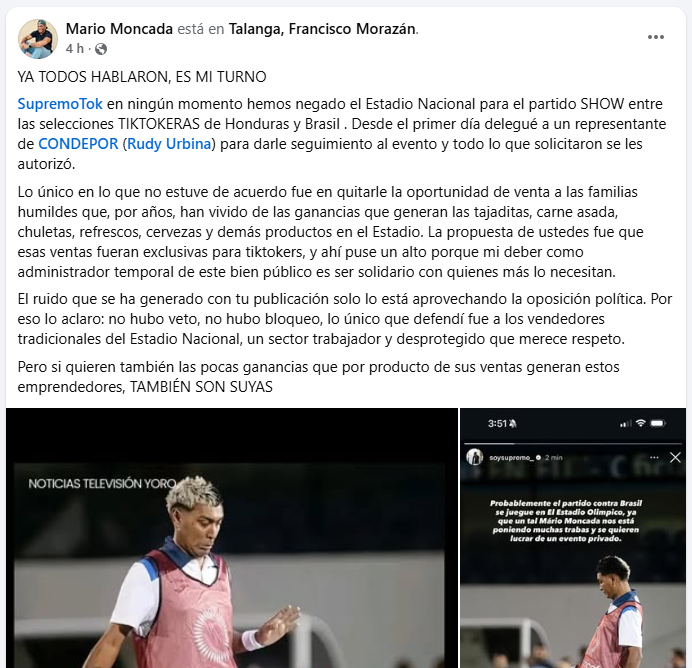 En sus redes, Supremo aseguró que Mario Moncada, titular de Condepor, estaba poniendo trabas y buscando lucrarse del evento. Incluso amenazó con trasladar el espectáculo a San Pedro Sula, presentándose como víctima de un supuesto bloqueo institucional.