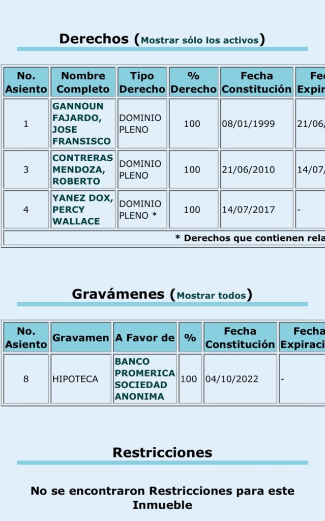 - 2022 (octubre): Percy hipoteca el inmueble a favor de Banco Promerica.