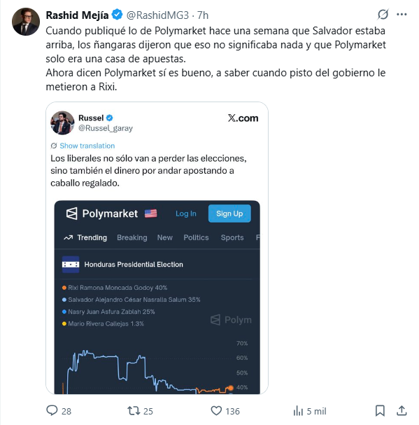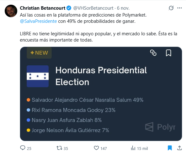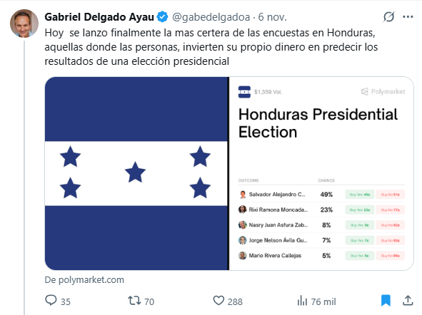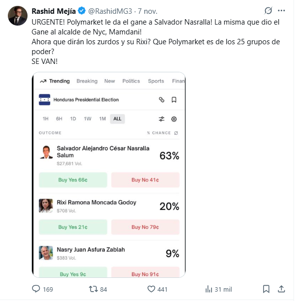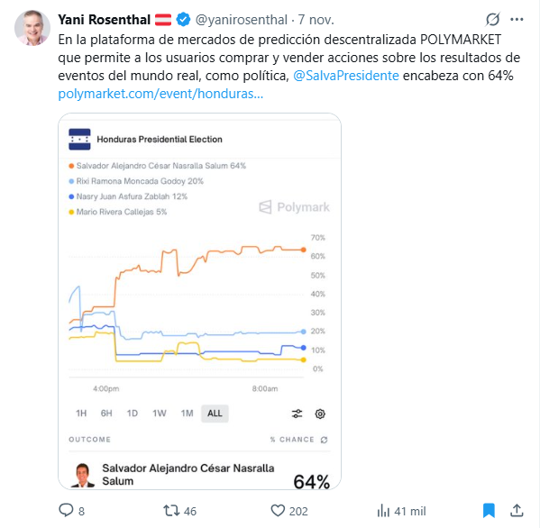 Hace apenas unos días, figuras vinculadas a la ZEDE Próspera, como Gabriel Delgado Ayau y Christian Betancourt , así como miembros de la oposición hondureña —entre ellos Yani Rosenthal y Rashid Mejía— celebraban en redes sociales los resultados del mercado, donde Salvador Nasralla aparecía como amplio favorito.