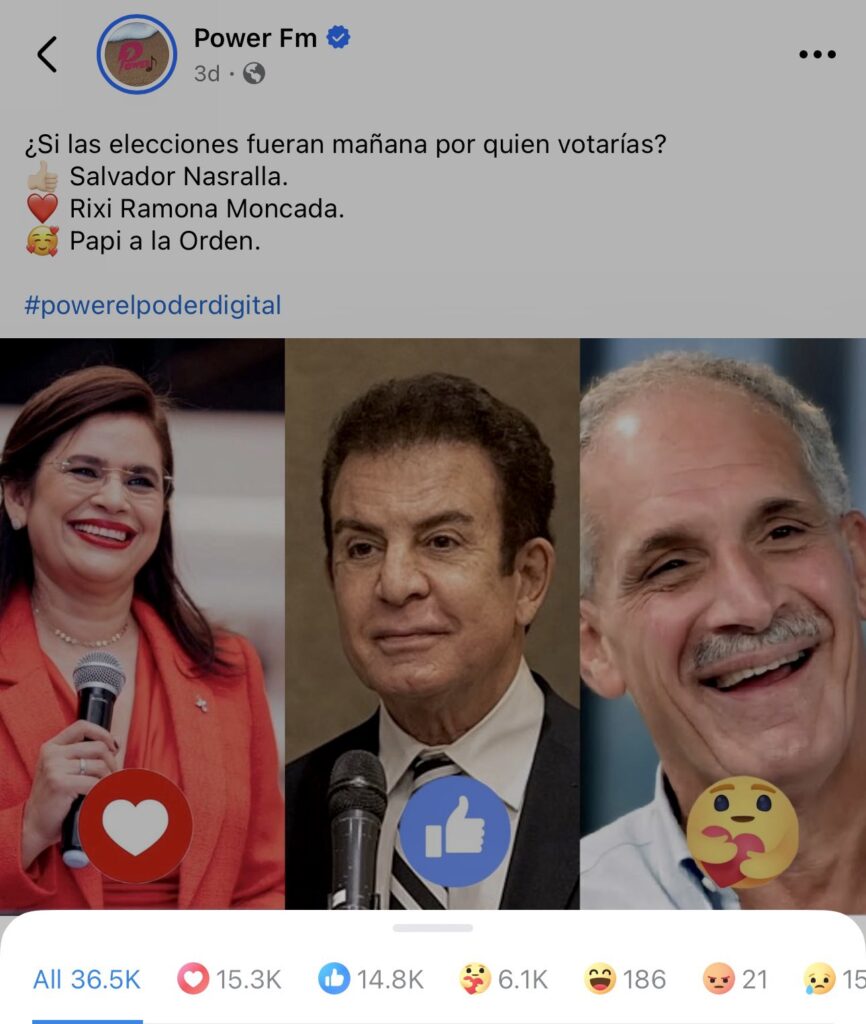 La influyente emisora hondureña Power FM lanzó una dinámica en Facebook preguntando a su audiencia: “Si las elecciones fueran mañana, ¿por quién votarías?”.